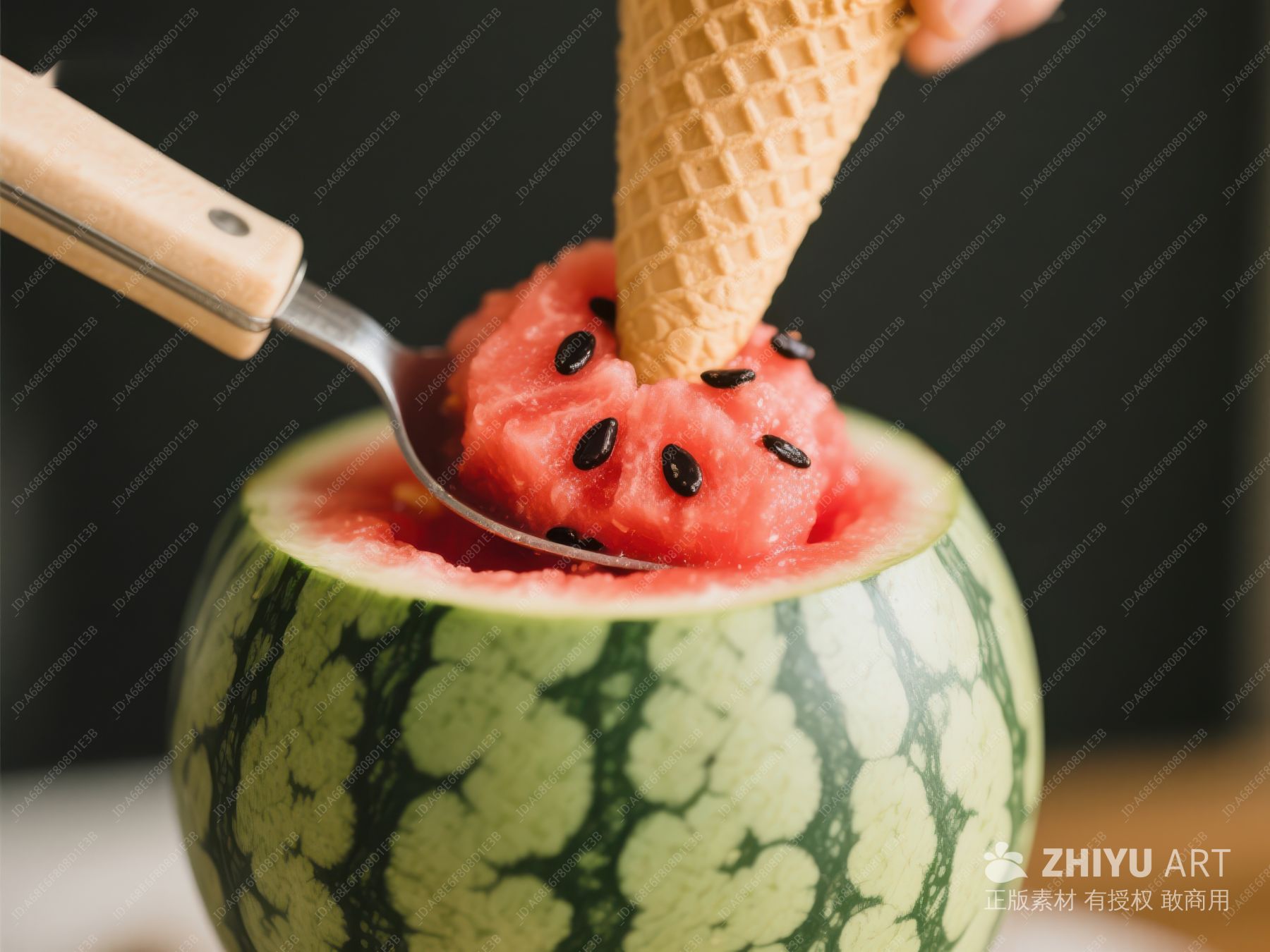 西瓜冰淇淋:勺子舀取果肉放入蛋筒 608
