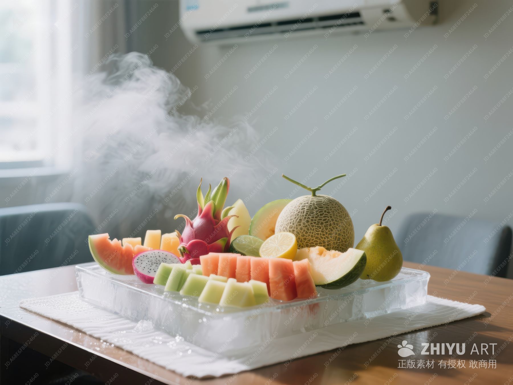 新鲜水果拼盘,冰块上冒着蒸汽 692