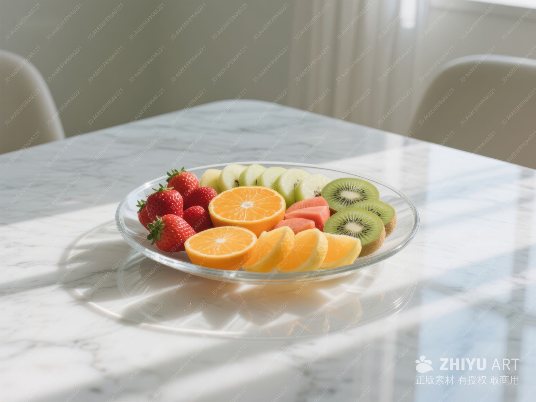 新鲜水果拼盘置于阳光下的白色桌布上 728