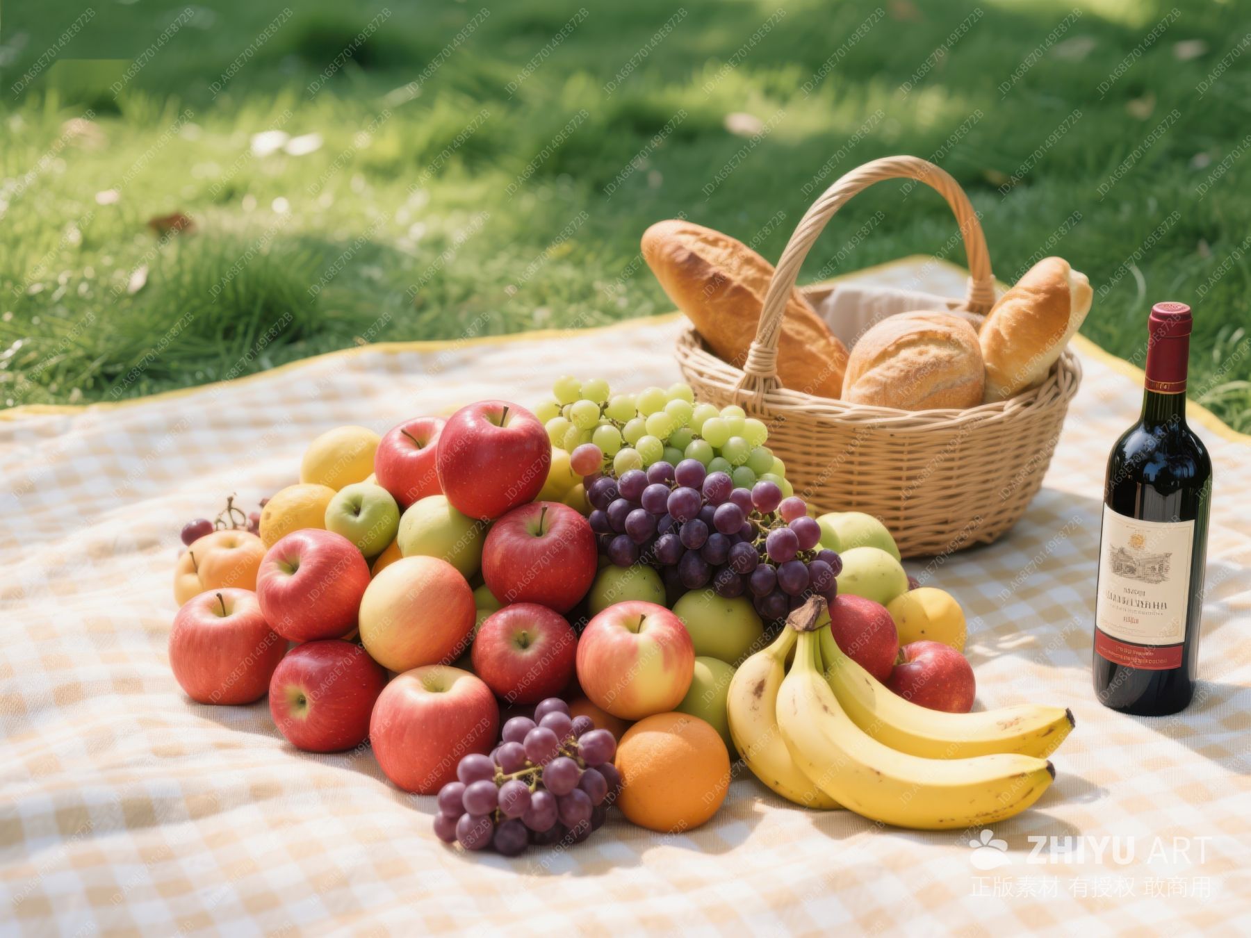 野餐布上的水果、面包和红酒 777
