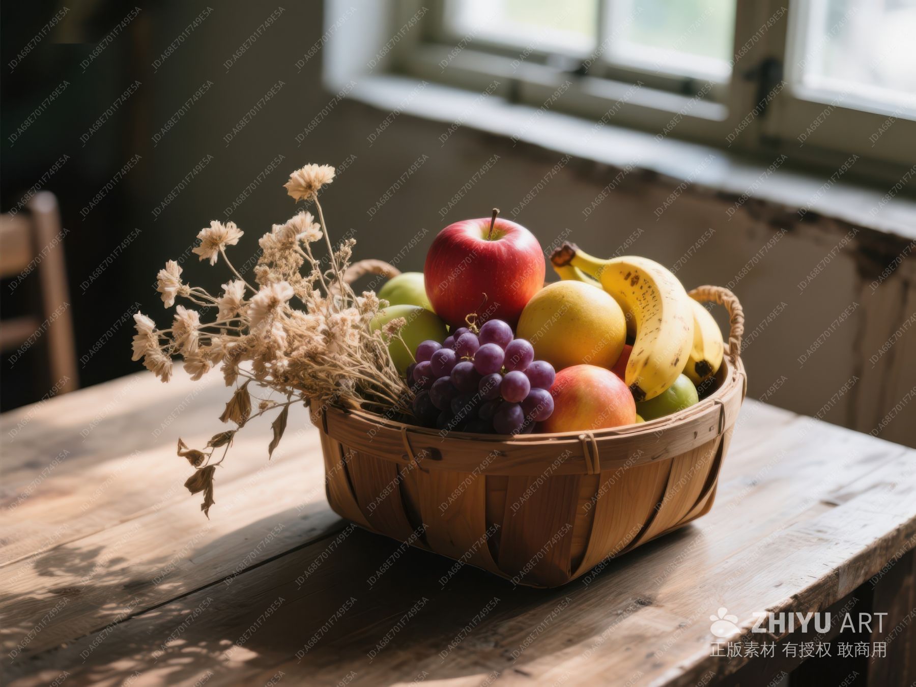 水果篮与干花装饰的温馨室内场景 535