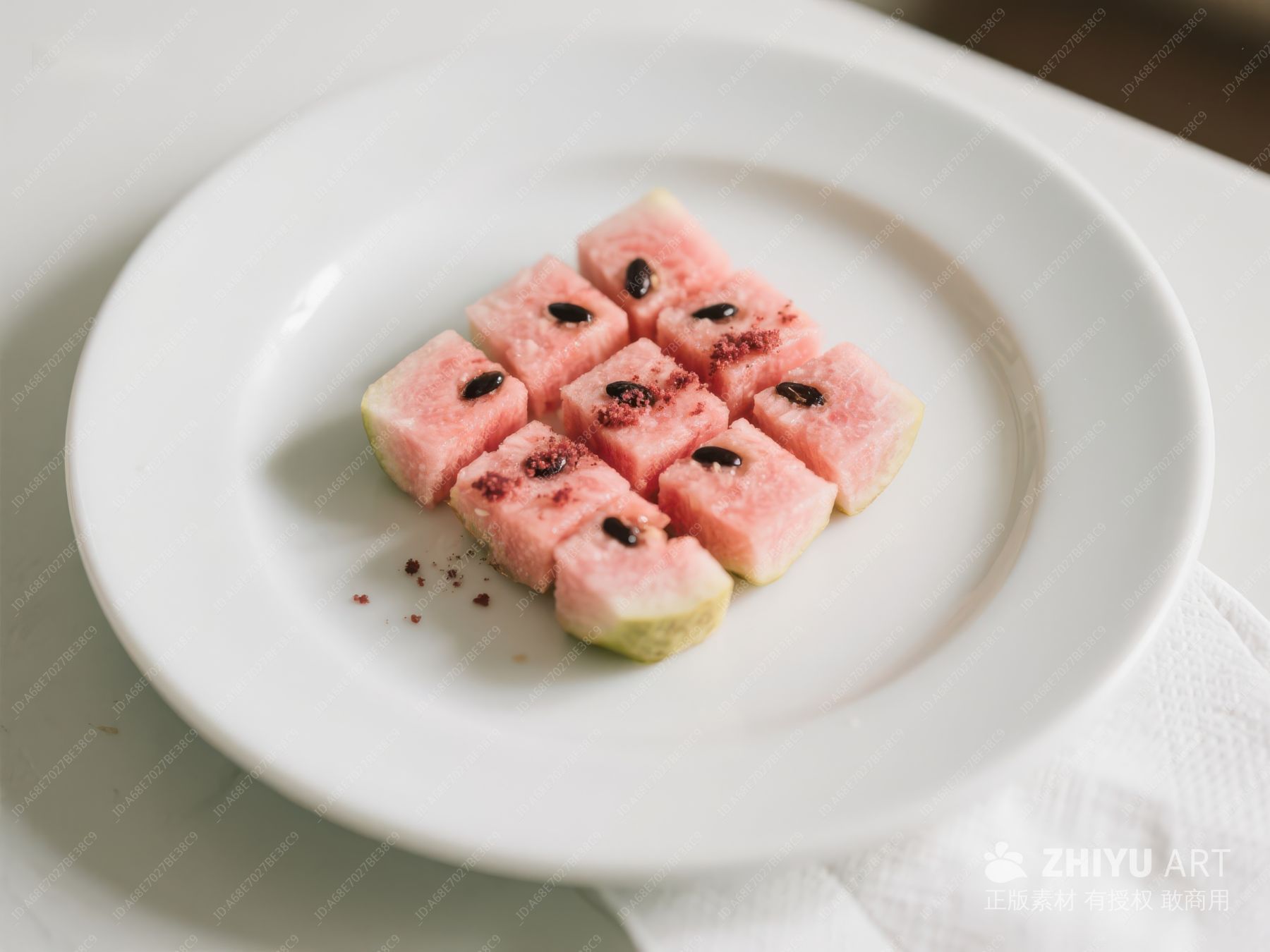 切块西瓜整齐摆放在白色盘中 447