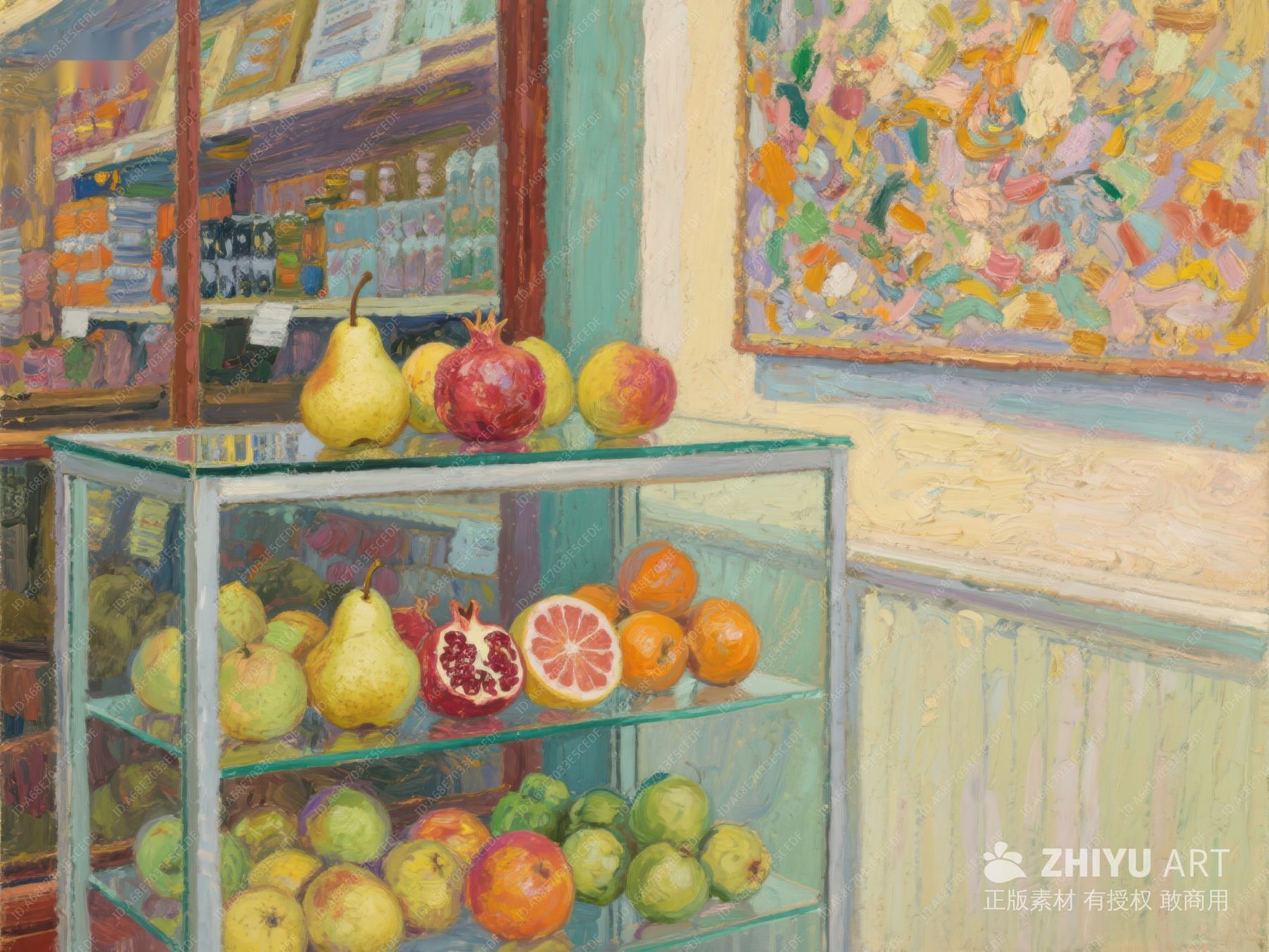 水果展示柜与抽象画背景 548