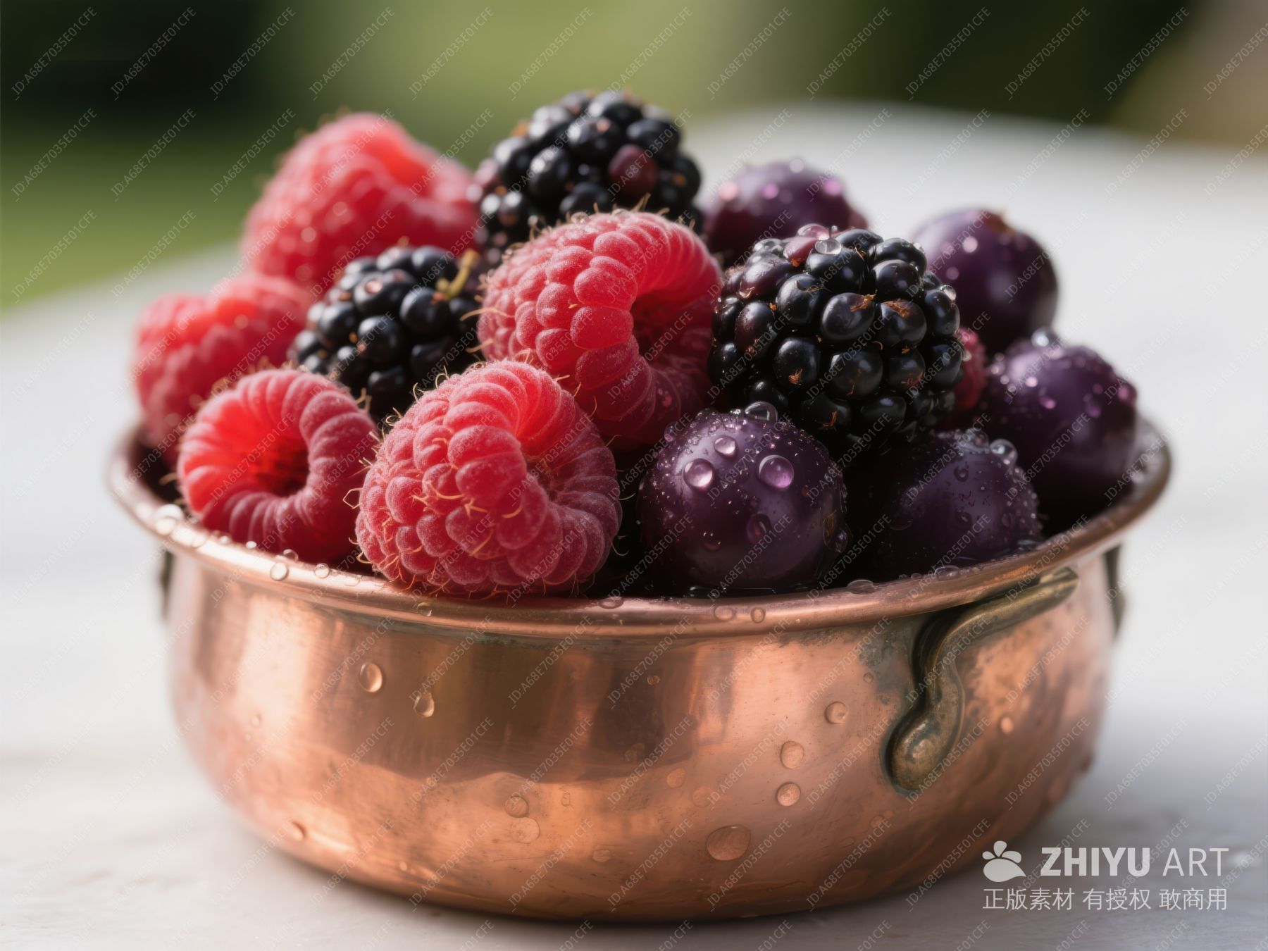 铜碗盛满新鲜浆果,背景为乡村庄园 596