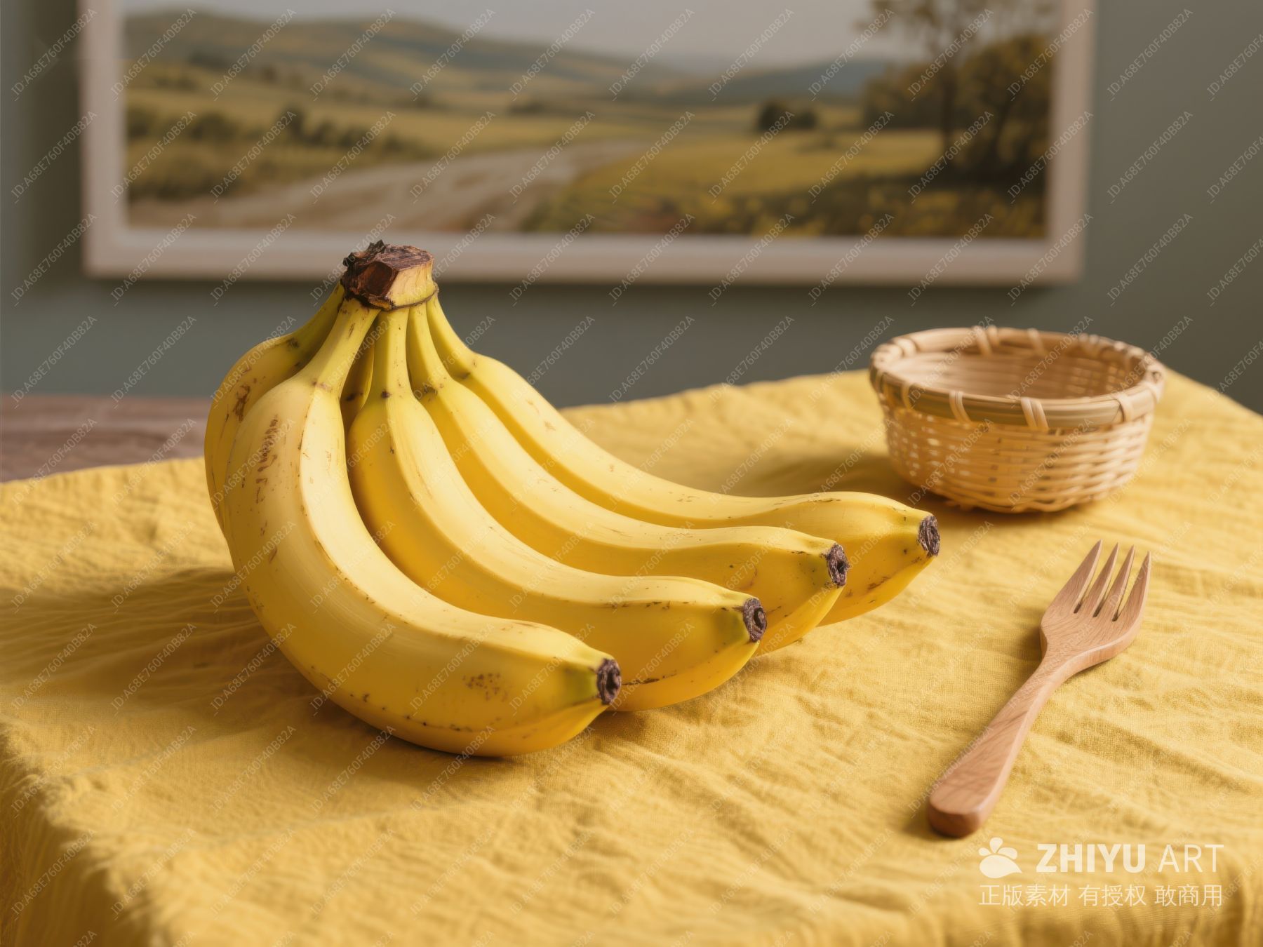 黄色桌布上的香蕉与叉子 152