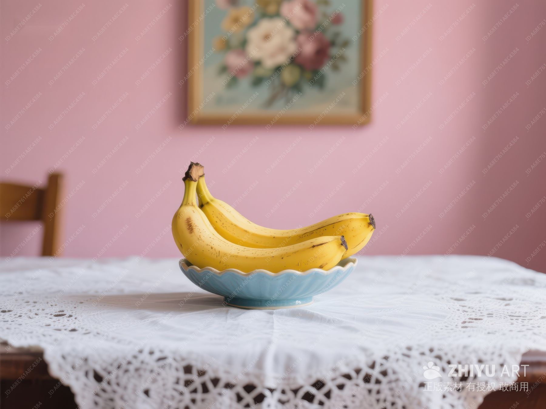两根香蕉并排放在一张质朴的木桌上,桌上铺着一块简单