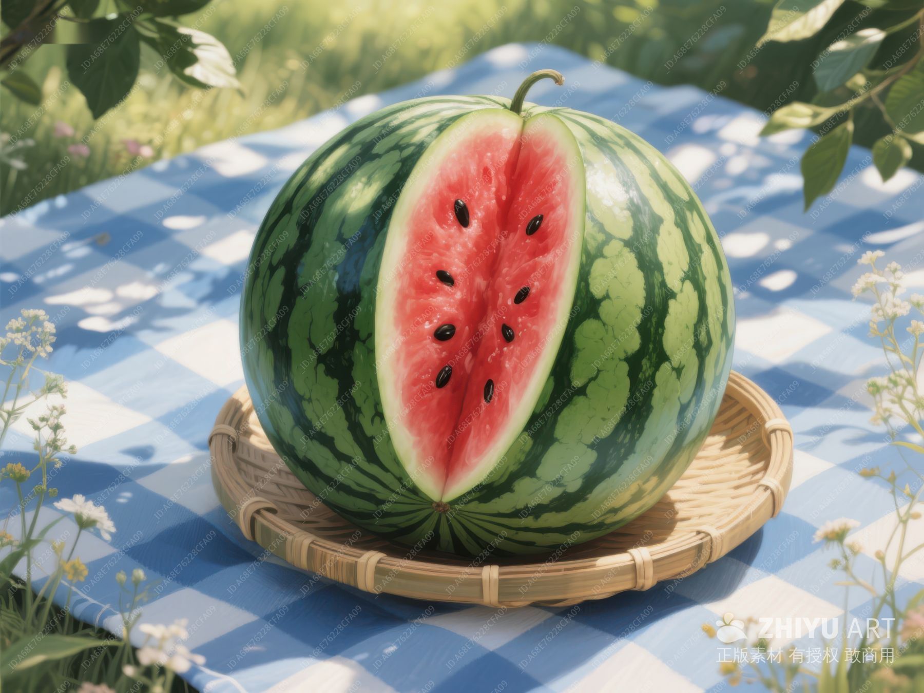 切开的西瓜置于蓝白格子布上 357