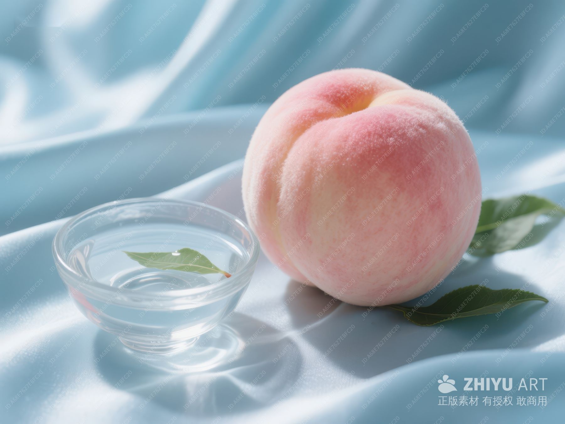 新鲜桃子与绿叶置于蓝色桌布上 634