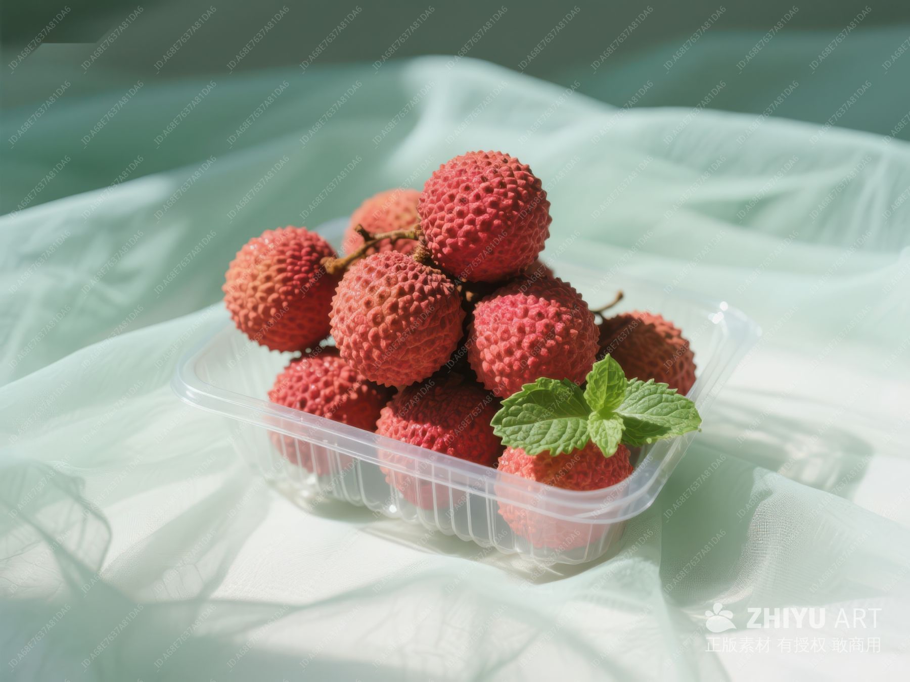 新鲜荔枝装满竹篮,色彩鲜艳 476