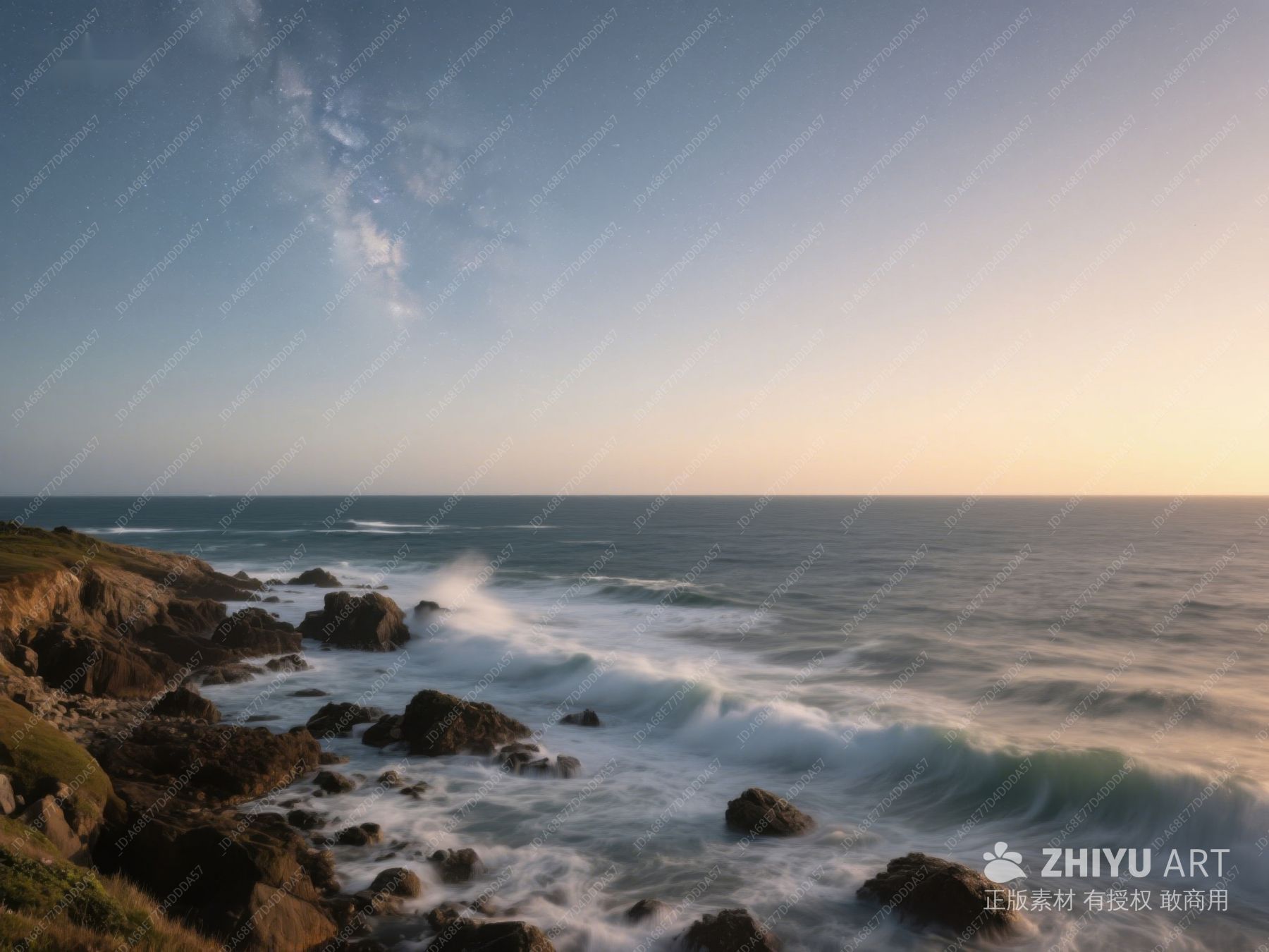 一块岩石俯瞰大海作为背景,有海鸥飞翔。夕阳的光辉洒