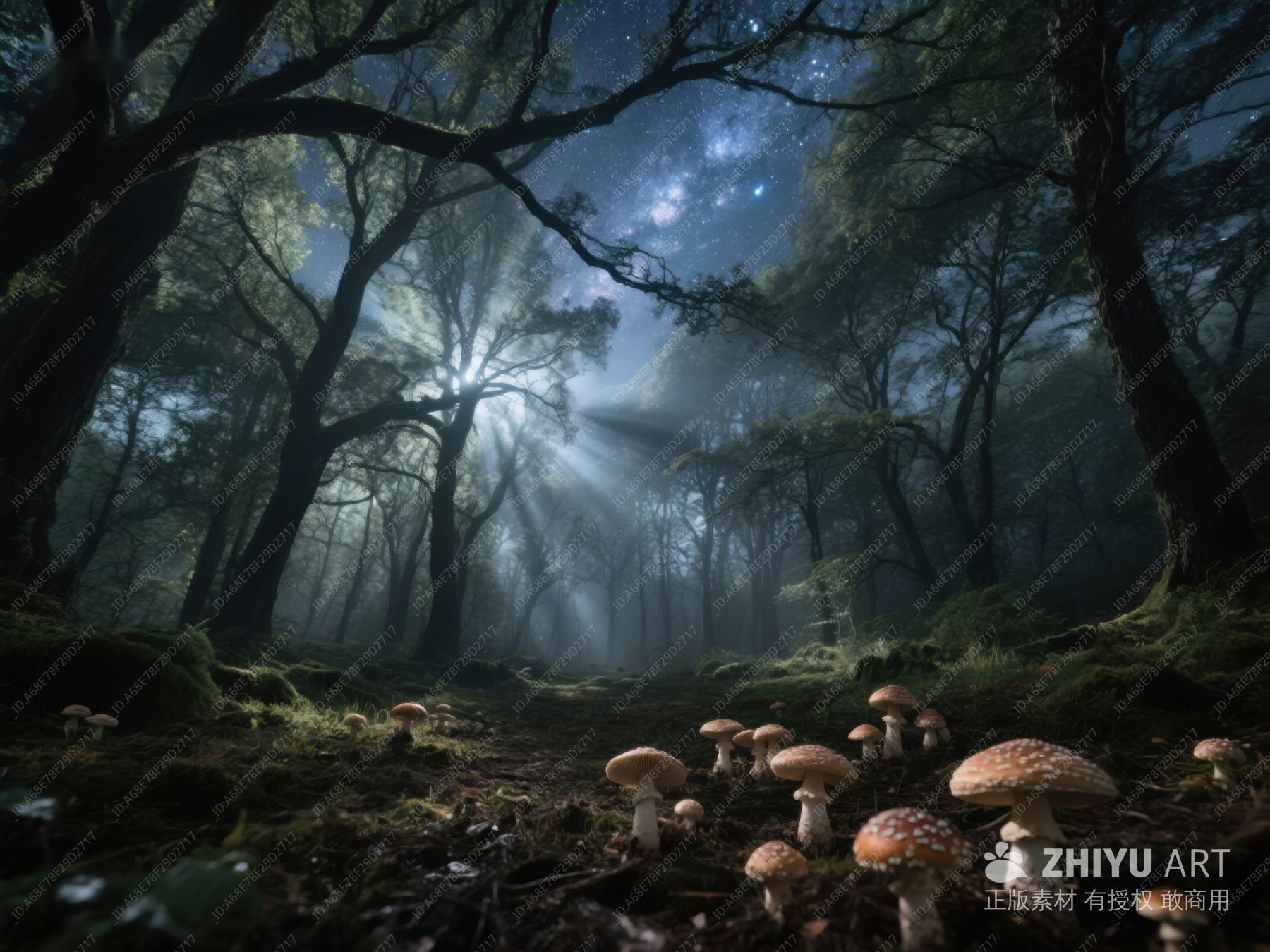 一个异想天开的场景,一个表面闪耀着水晶光泽的蘑菇,