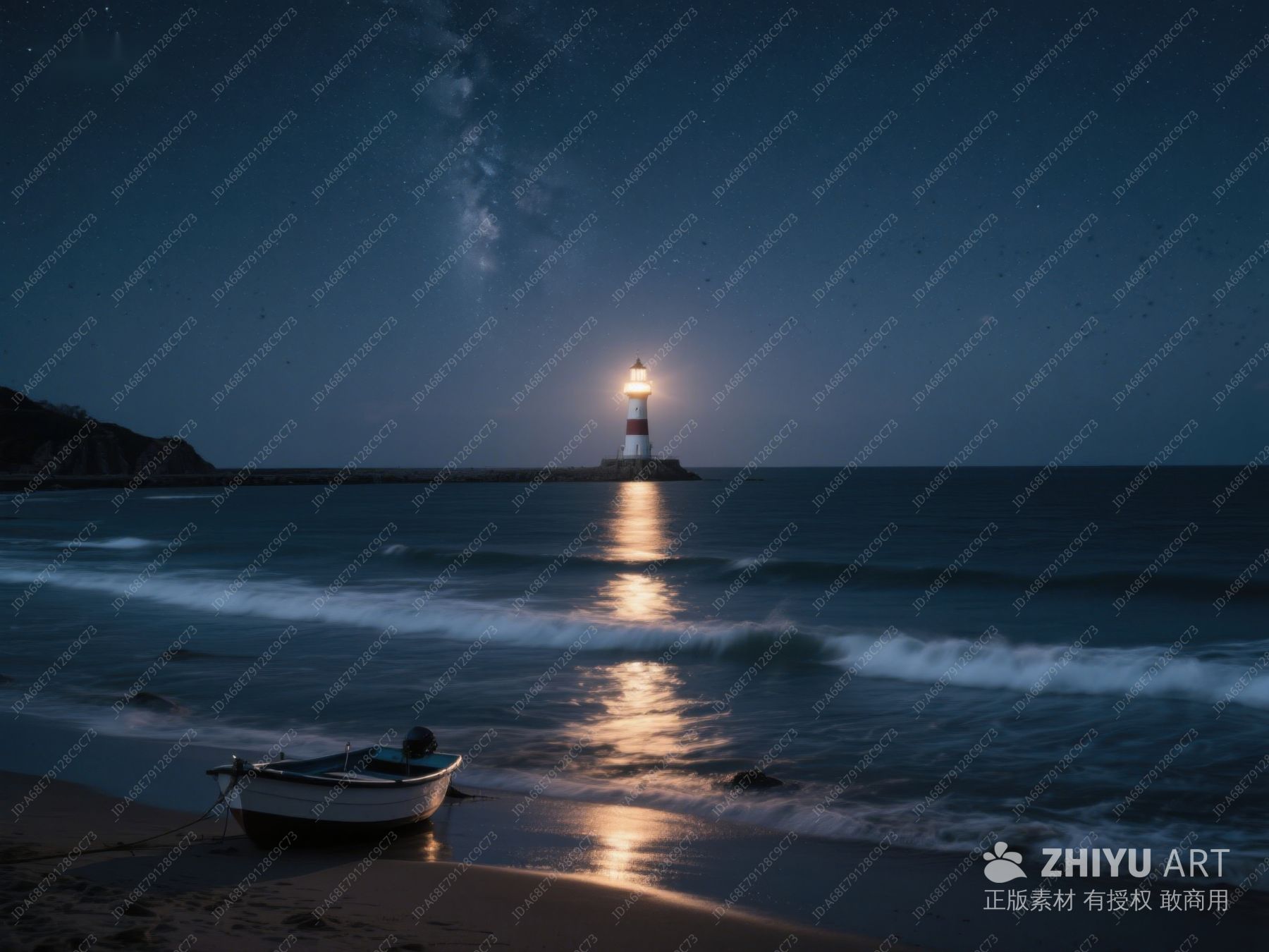 夜幕下的灯塔照亮波涛汹涌的海面 480