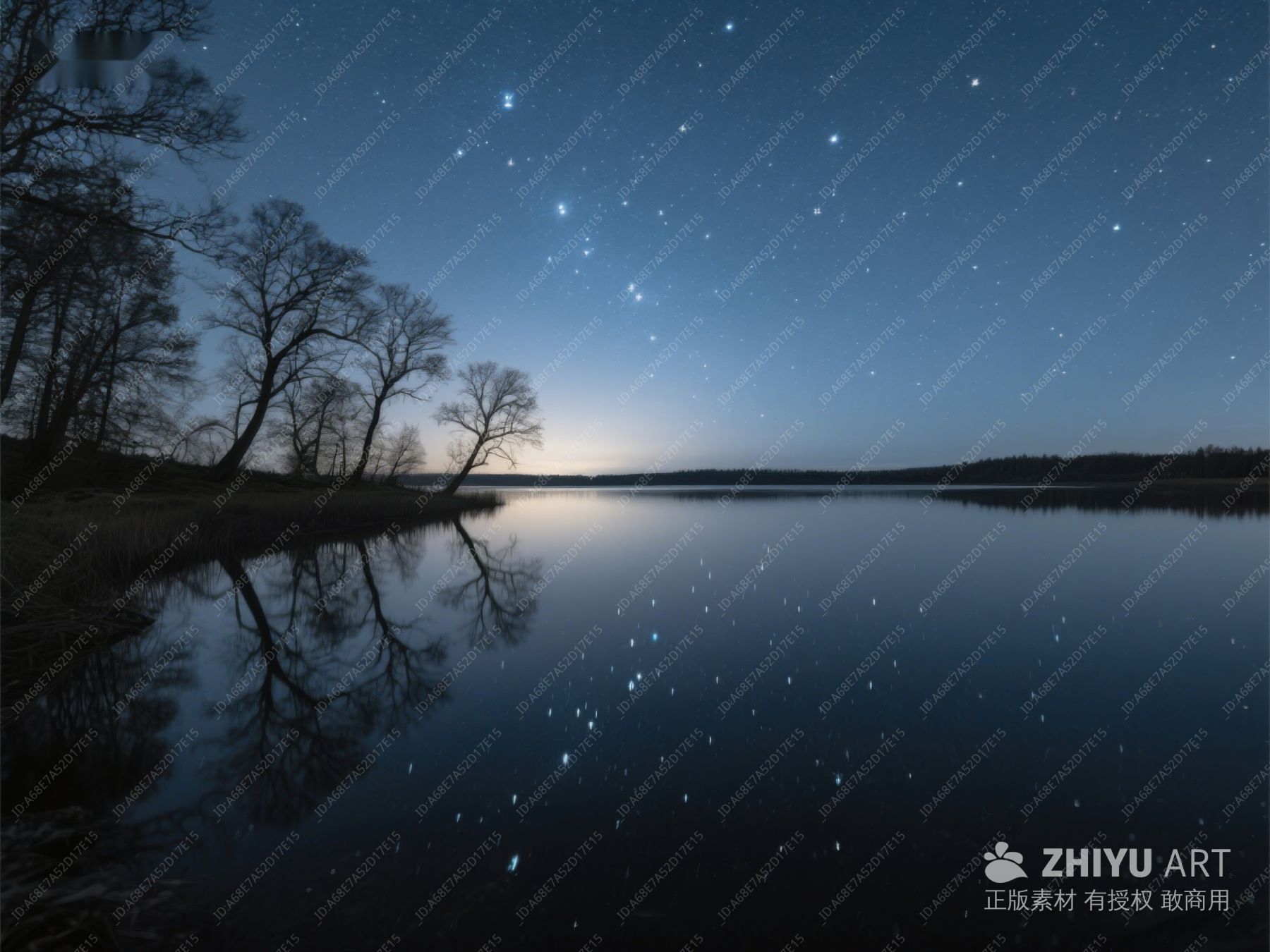夜空星辰映湖面,静谧树影伴水光 409