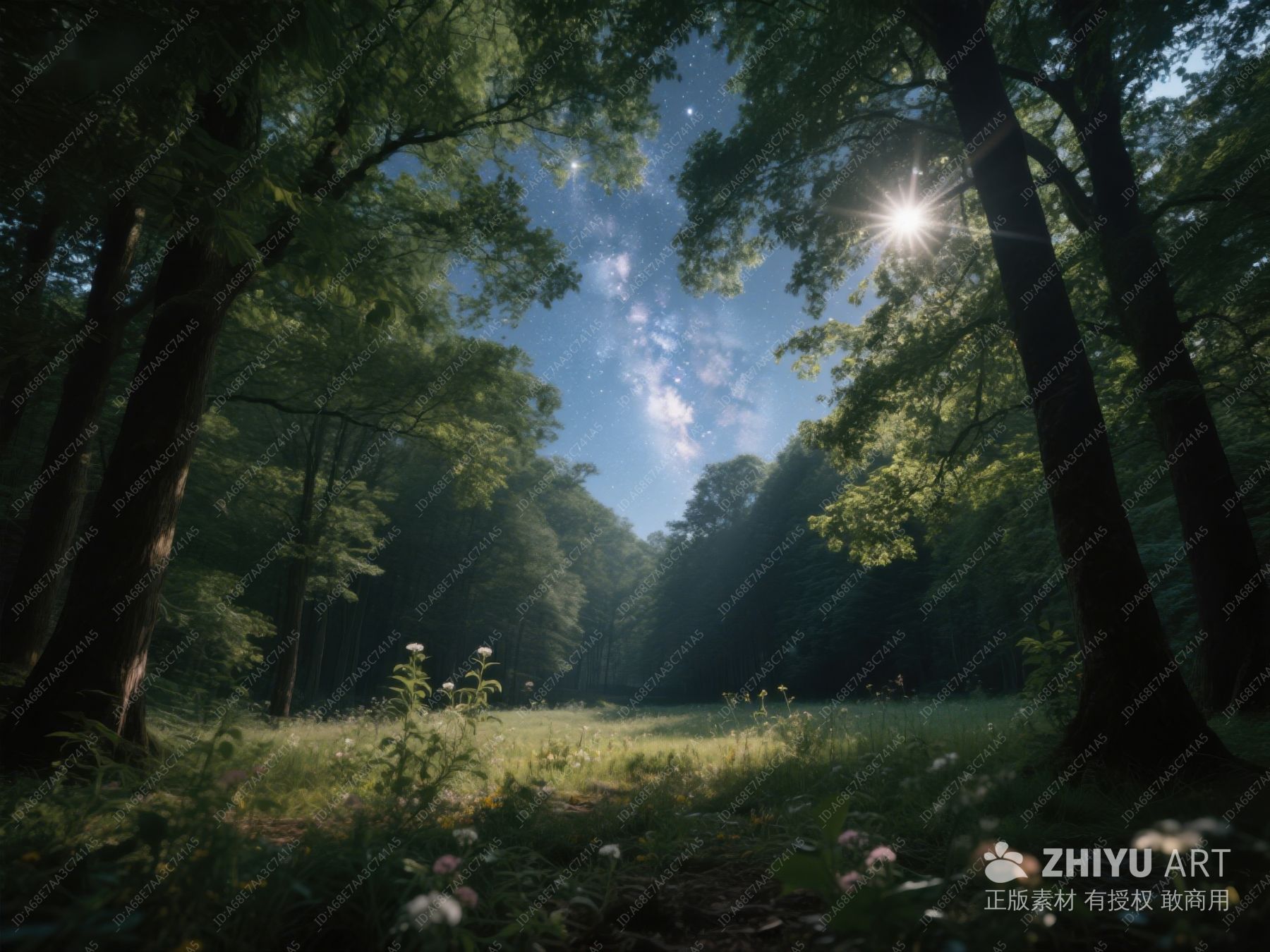 阳光穿过森林,照亮各种大小的树木。画面呈现出一种深