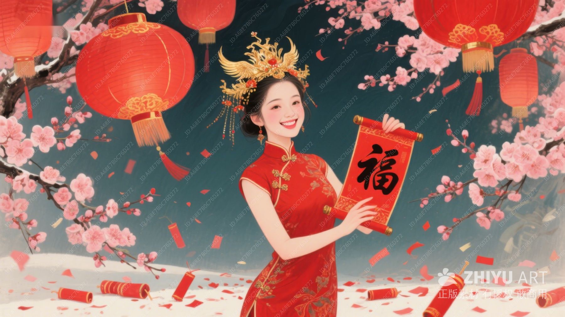 女子手持福字卷轴,红灯笼映衬喜庆氛围 732