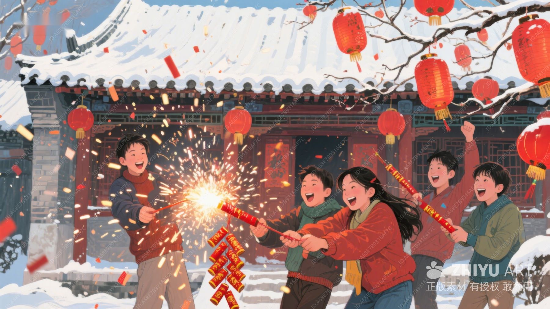 春节喜庆场景:孩童放鞭炮,家人欢聚 134