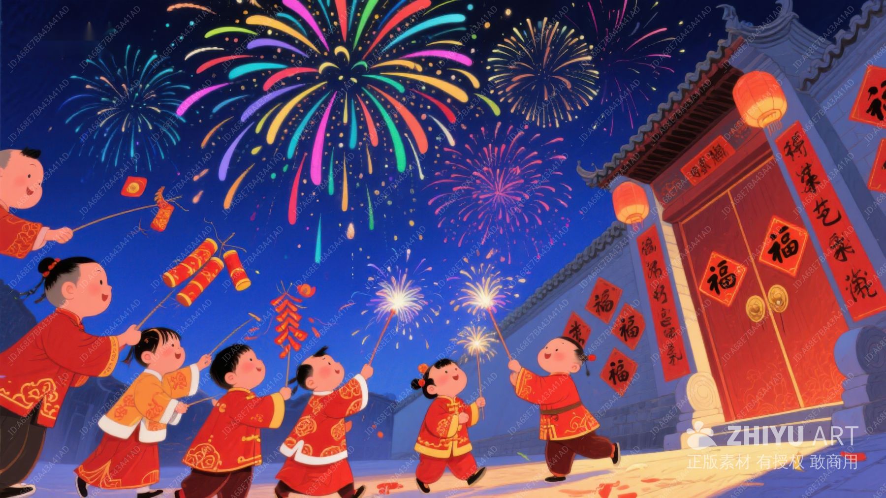 春节喜庆场景:孩童放鞭炮,家人欢聚 134