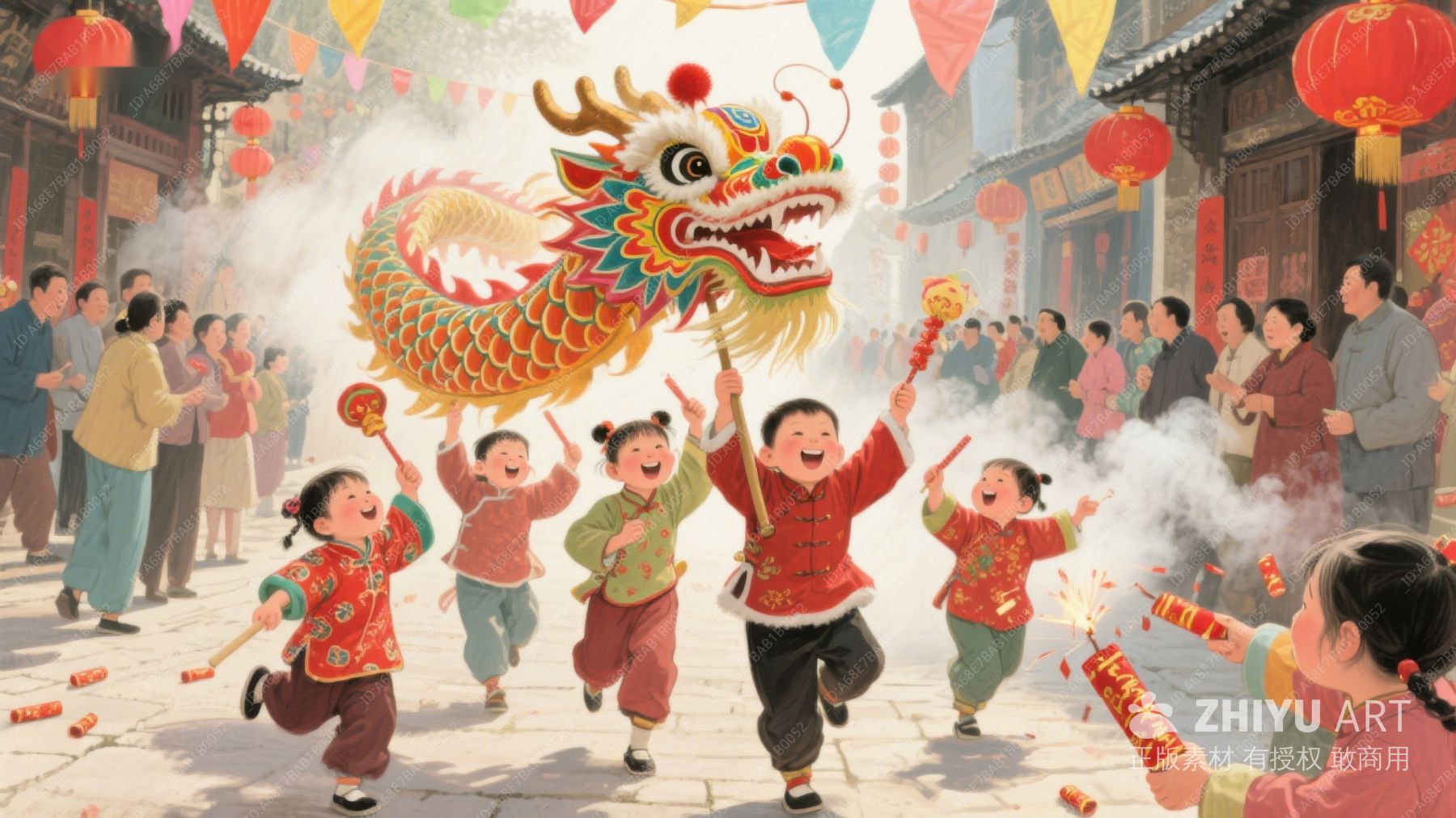 欢庆春节:舞龙舞狮与孩童嬉戏 389
