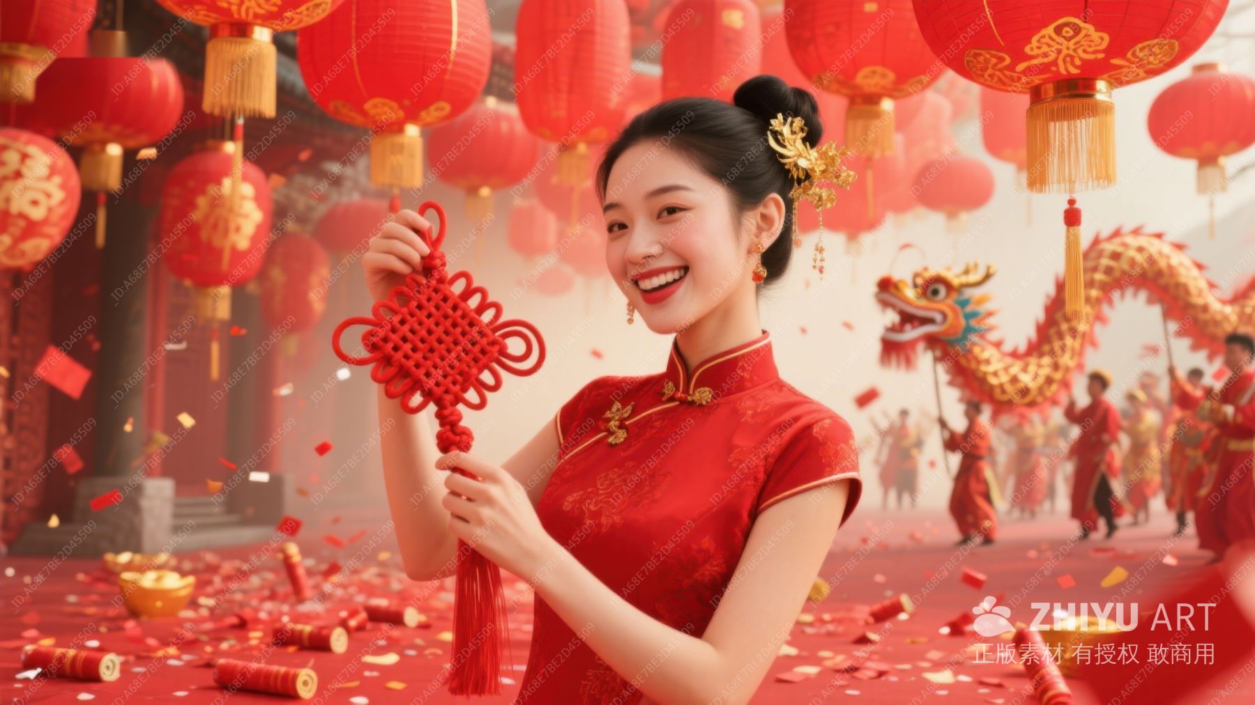 女子身着红裙手持中国结,背景舞龙灯饰 695