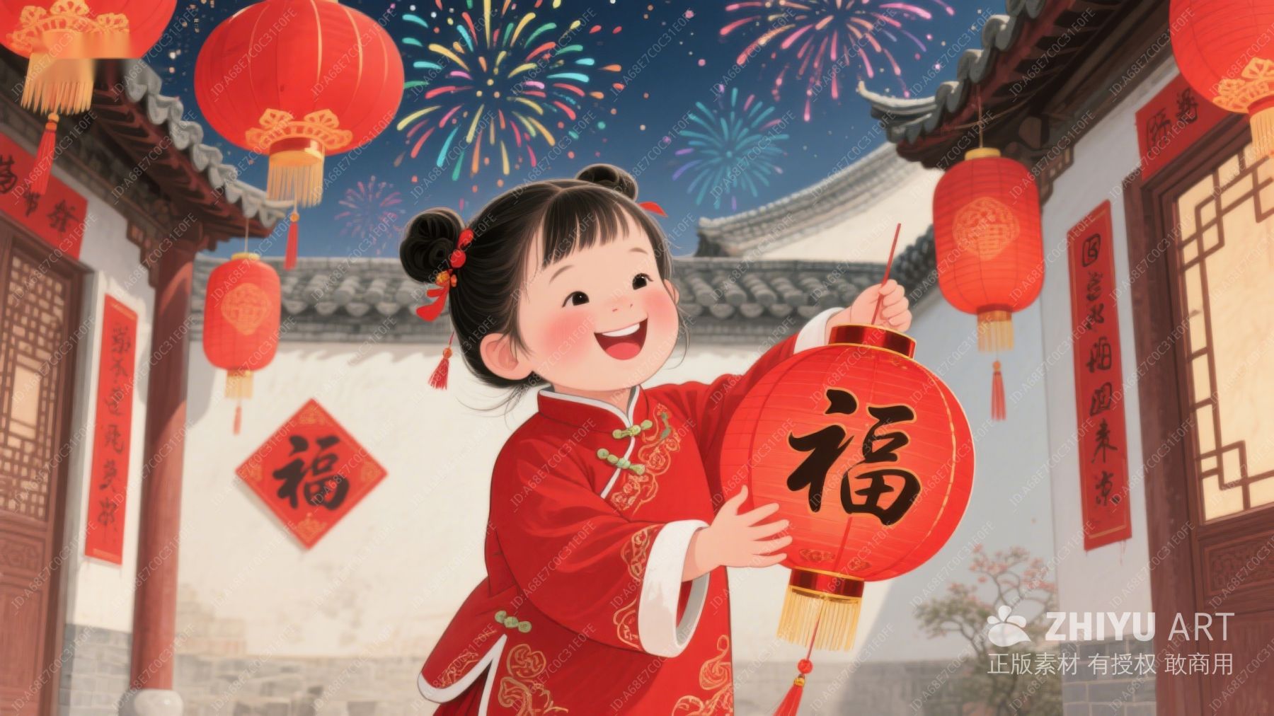 红衣女子怀抱金鱼,灯笼福字映衬节日氛围 332