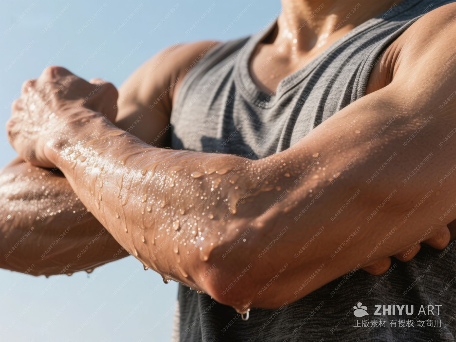 一个肌肉发达的3D男性,他的右手展示着手臂,左手指