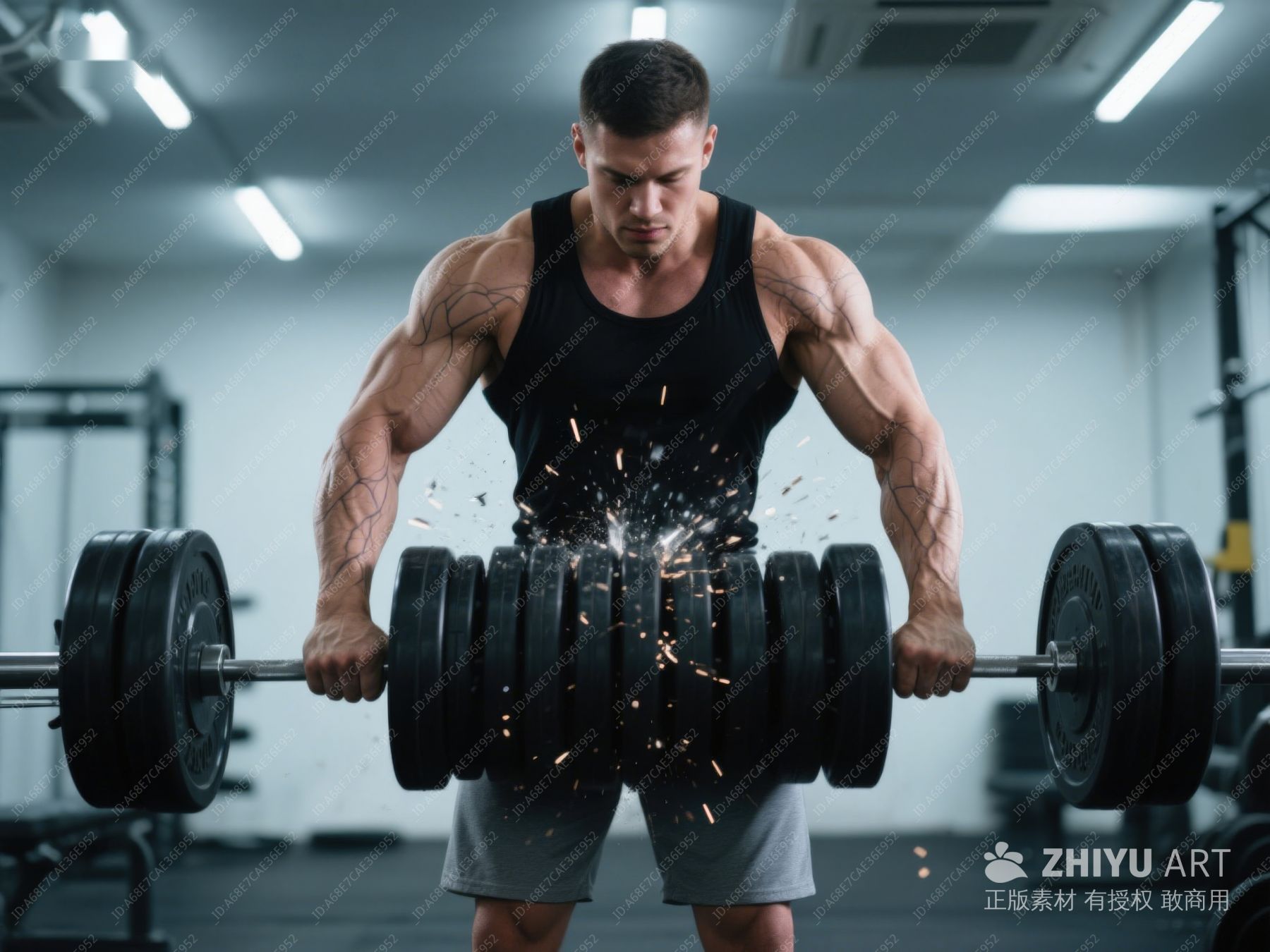 健身房内,健身器械排列,音乐节奏感强烈。一位健美运
