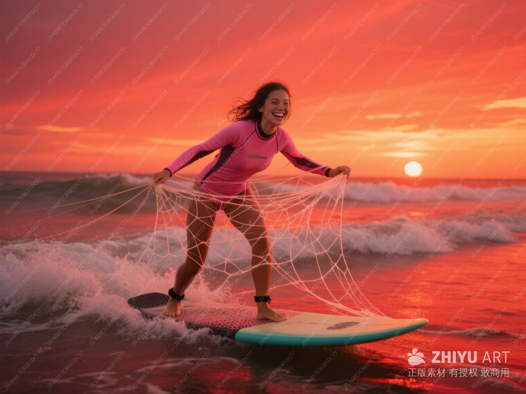 夕阳下,女子在海浪中手持渔网 210
