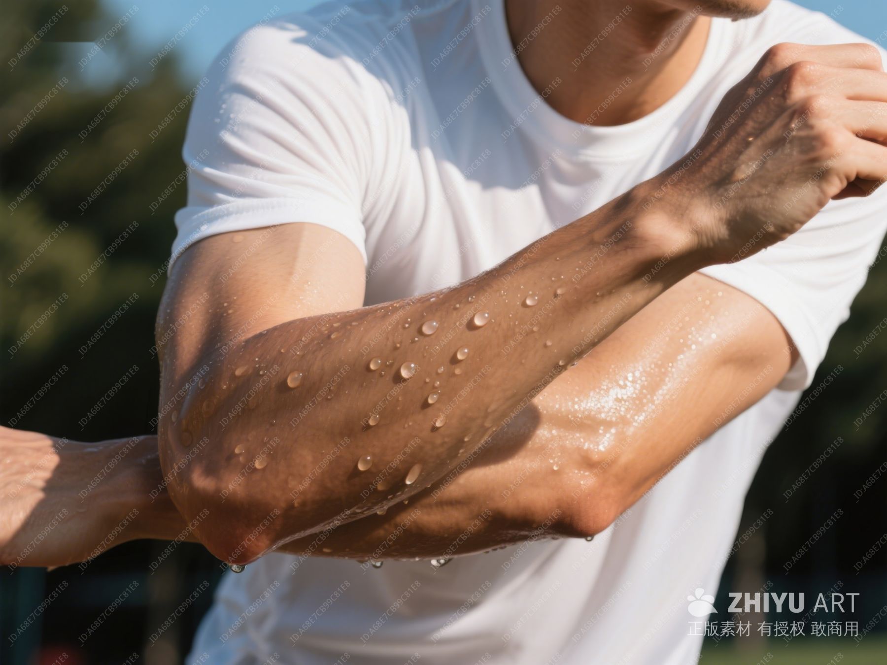一个肌肉发达的3D男性,他的右手展示着手臂,左手指