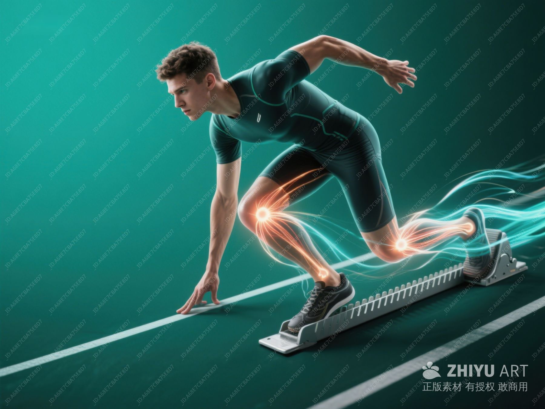 一名肌肉发达的运动员正在跑步,周围环绕着火焰。背景