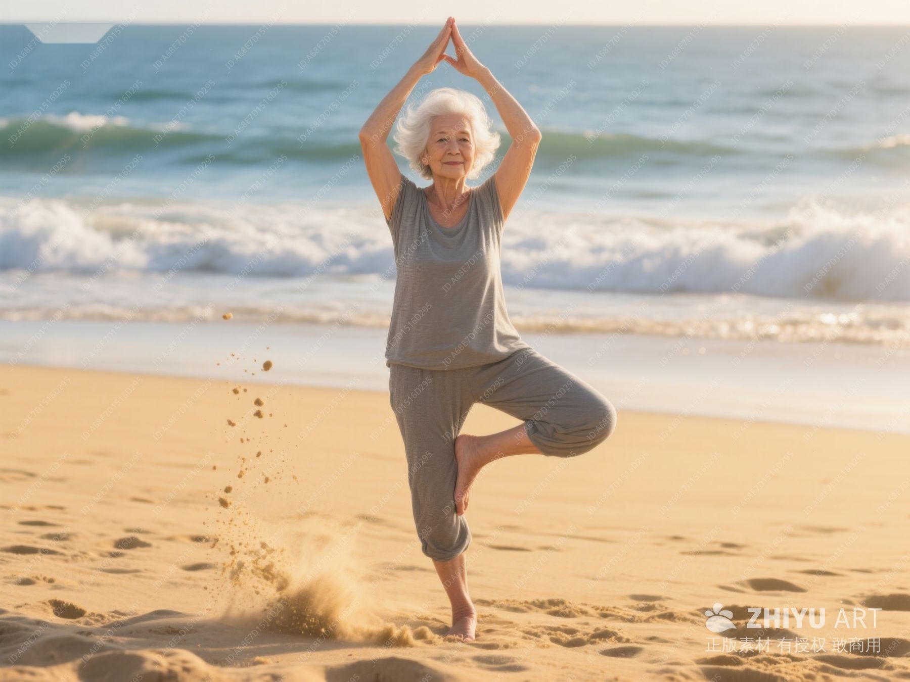 海滩上,一位身穿红色比基尼、佩戴花环的女子盘腿而坐