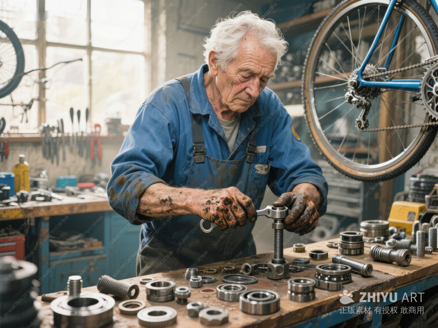 资深技师在车间修理自行车 909