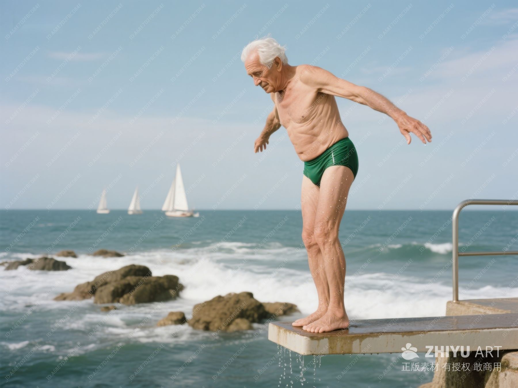 老人海边跳水台准备跳跃 391