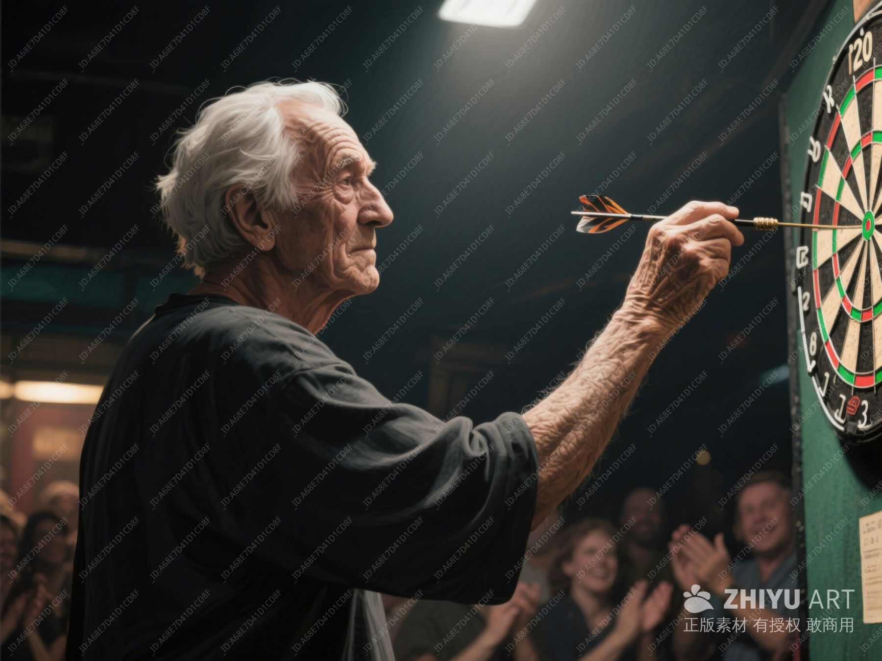 老人专注投掷飞镖,观众热烈鼓掌 583