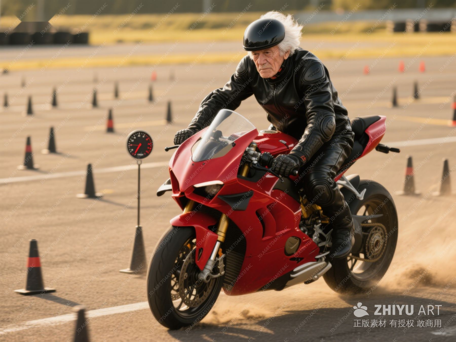 一辆红色跑车摩托车行驶在城市街道上,骑车者戴着黑色