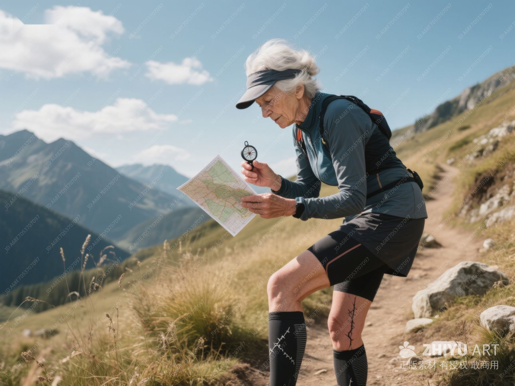 一位穿着蓝色紧身衣的女性走在山路上,山路两旁是连绵