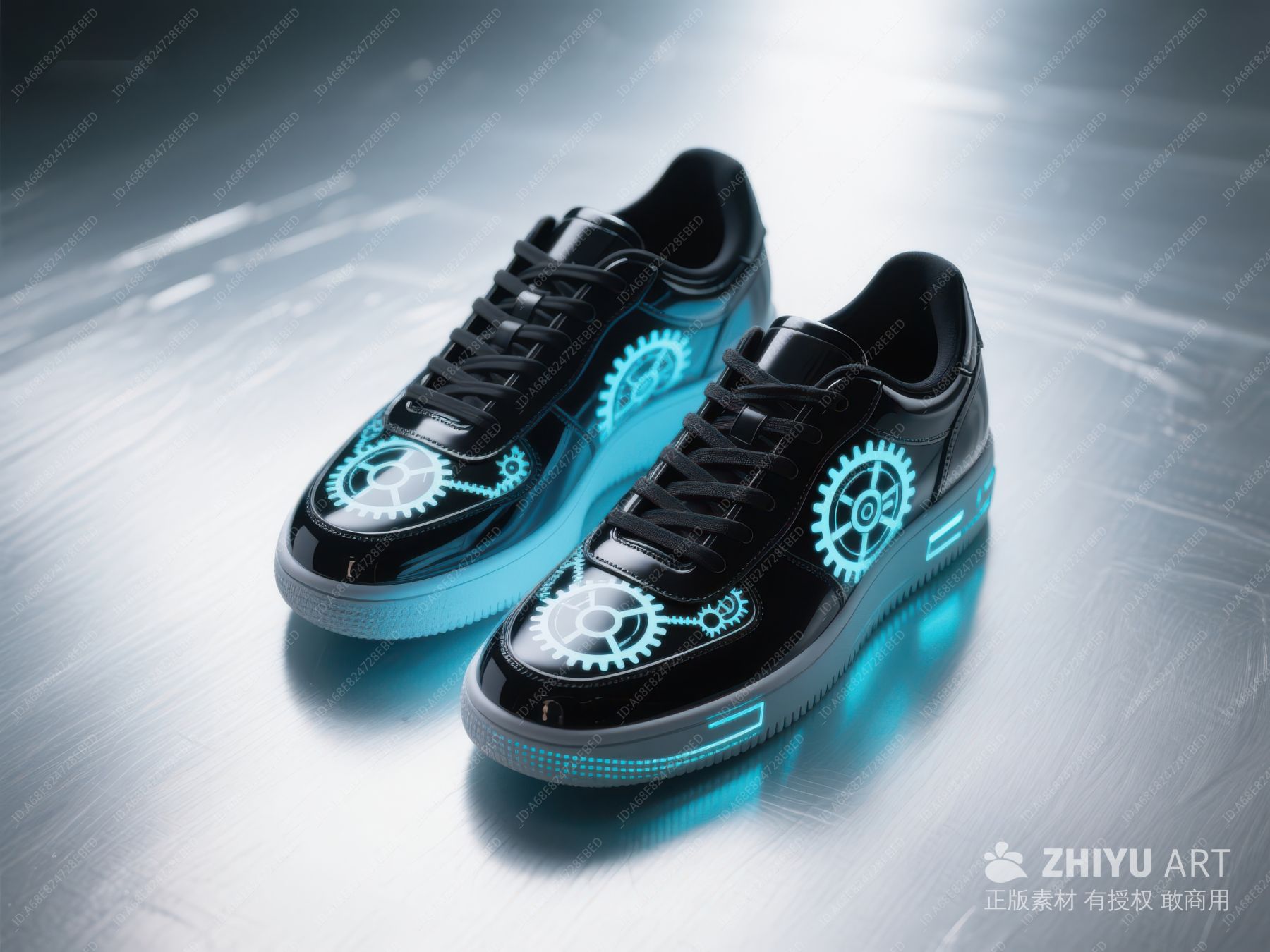 一对具有发光点缀和高科技设计的时尚未来运动鞋,背景