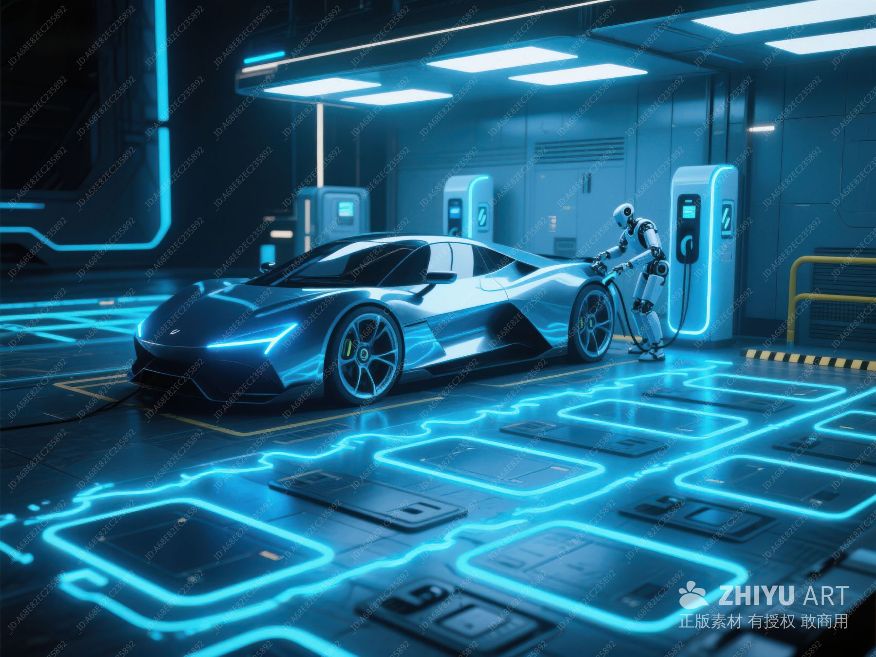 现代化的充电站,多辆电动汽车正在充电,充电站旁有太