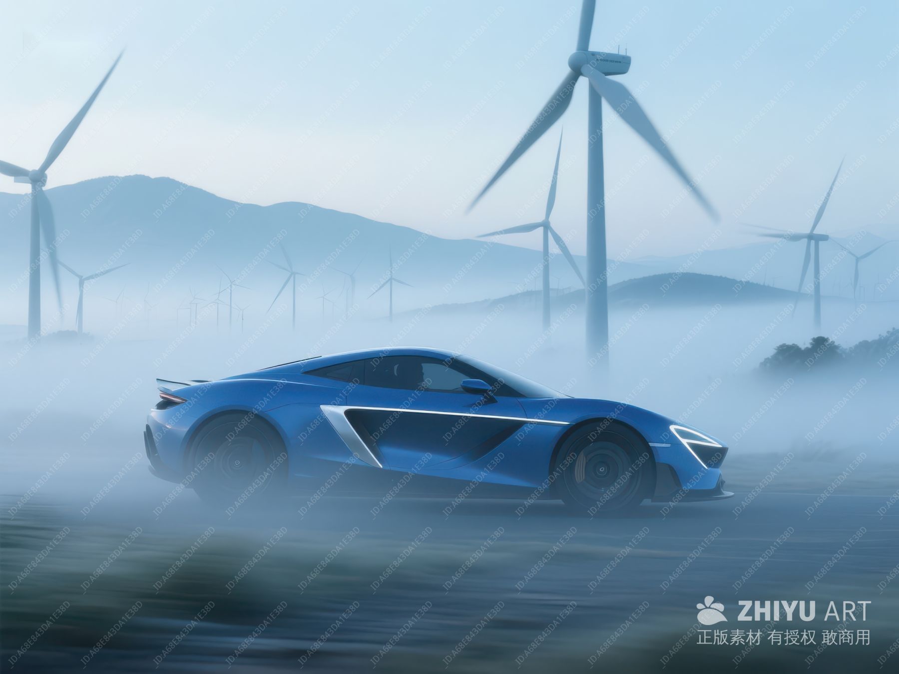 蓝色跑车疾驰于风力发电机前 194