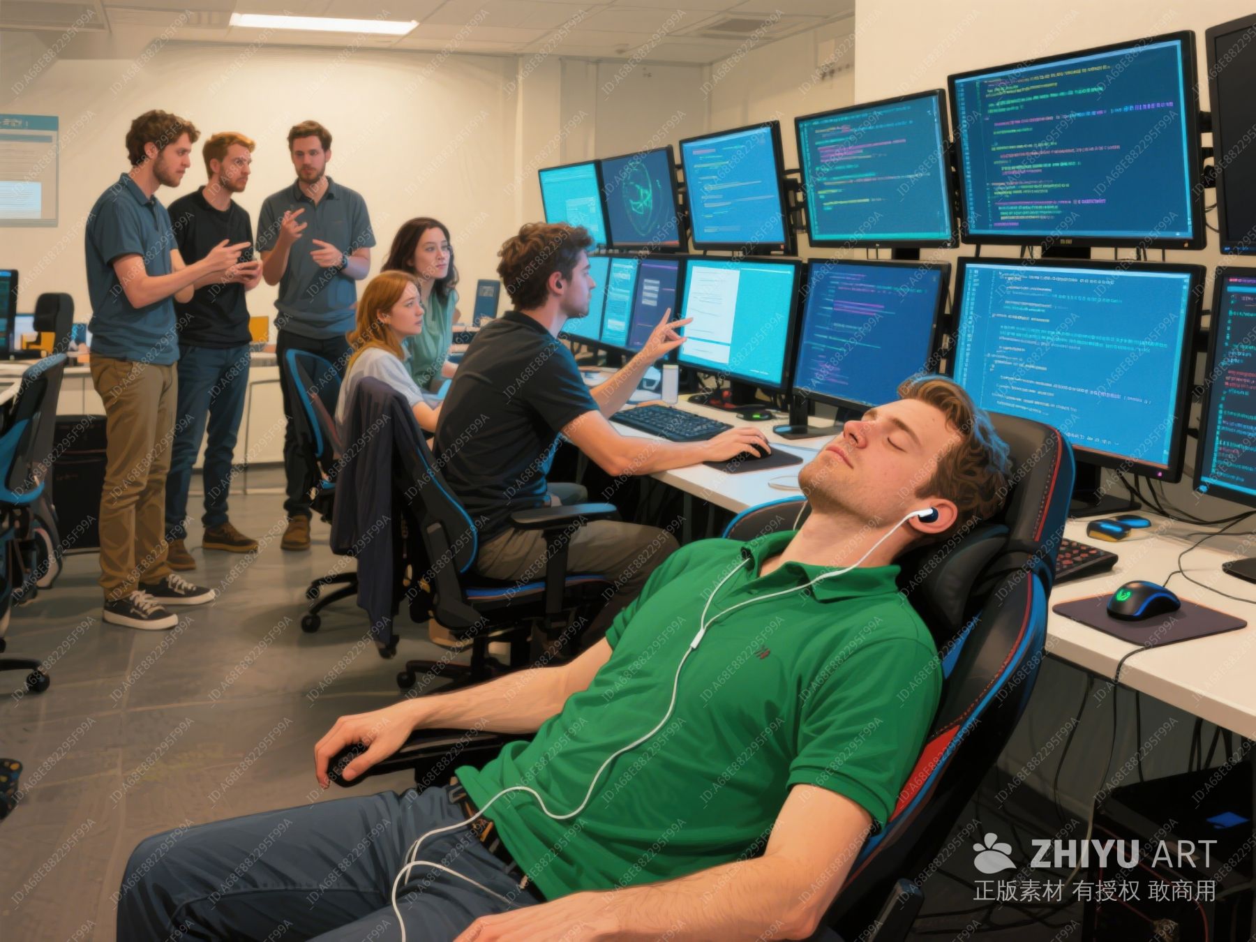 办公室里,一个年轻男子坐在椅子上,面对电脑屏幕。摄