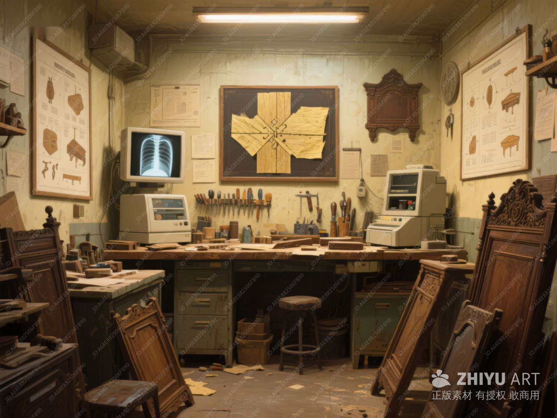 一个杂乱的复古车库内,一位戴着护目镜和皮革围裙的老