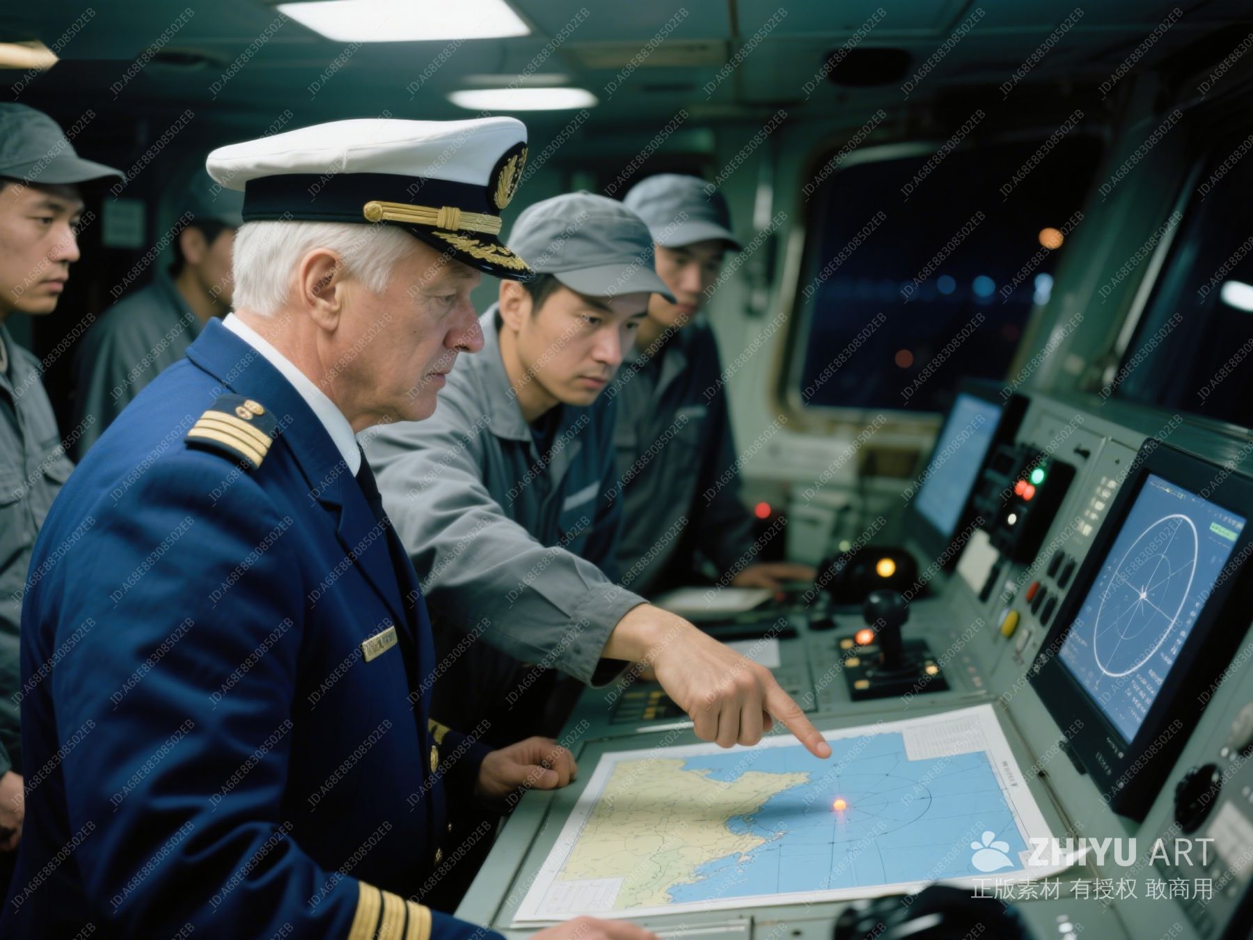 一位英国皇家海军上尉站在甲板上,背景是灰蒙蒙的雨天