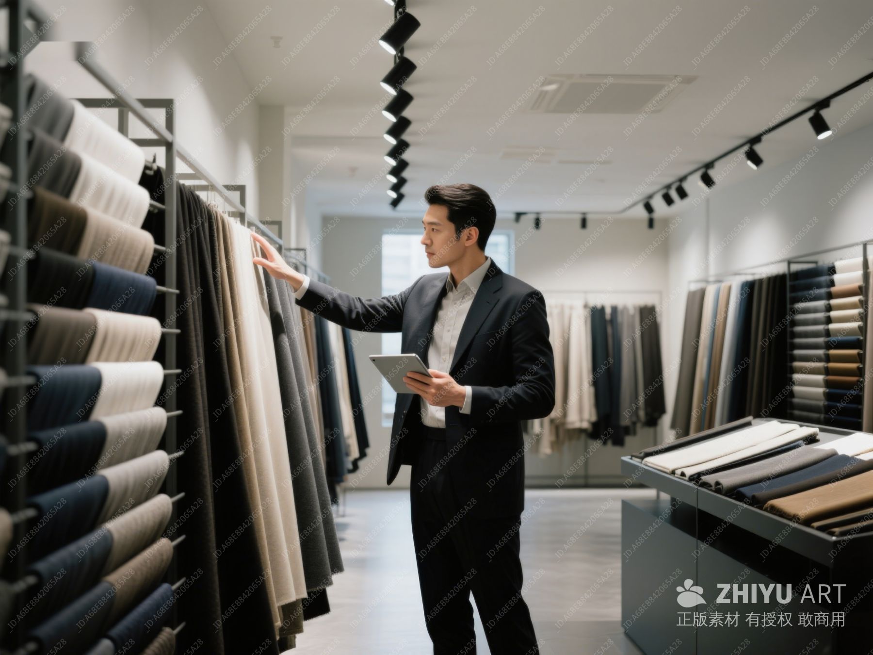 一位身着蓝色西装的男士站在现代化的办公楼走廊里,他