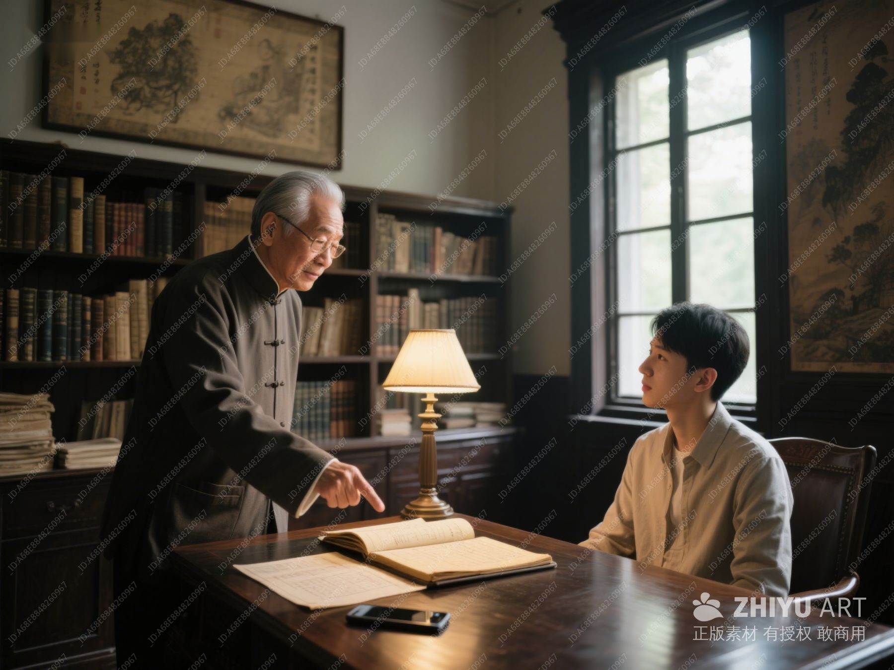 一位大约55岁的教授坐在书桌前,桌上有一盏台灯照亮