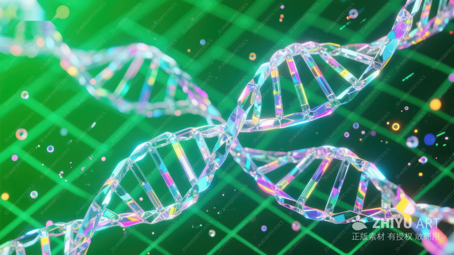 在黑色背景下,呈现发光的基因链,一些DNA珠子缺失