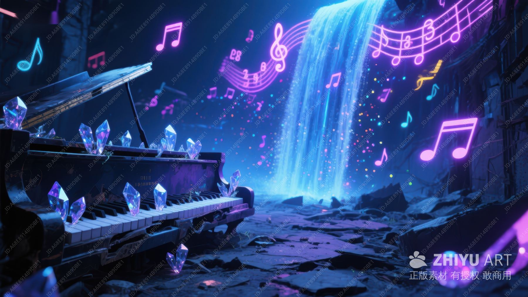霓虹音乐符号环绕的水晶钢琴 445