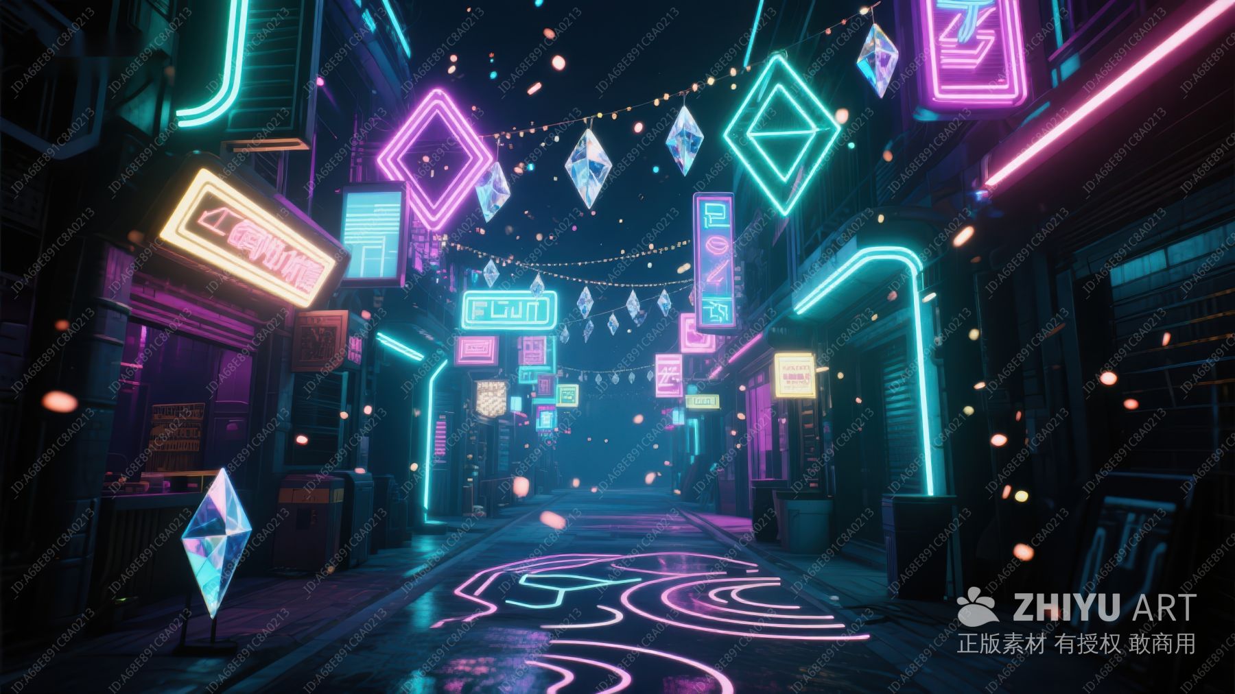 霓虹灯闪烁的未来城市街道,高楼林立,建筑外墙上布满