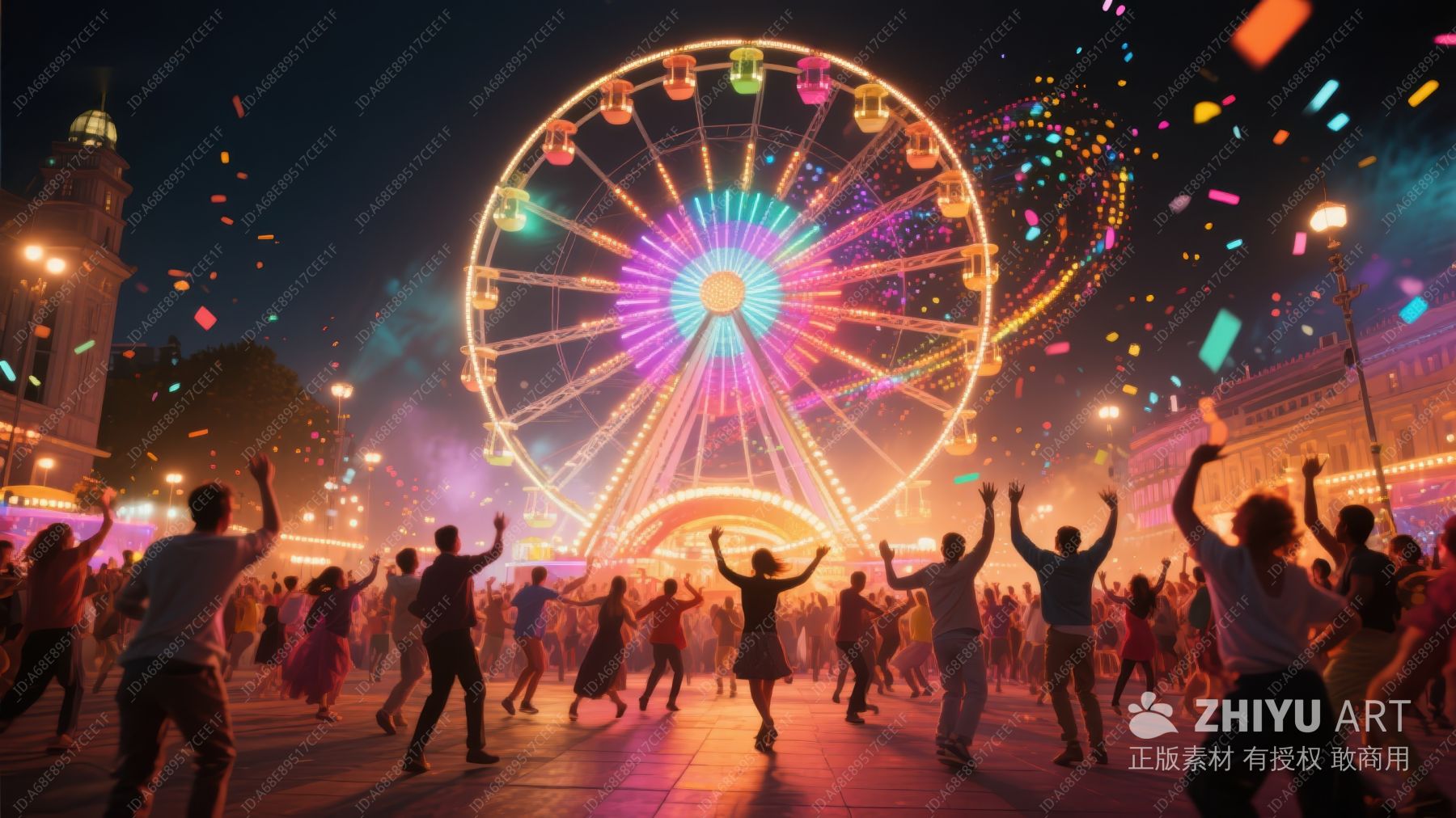 一个巨大的、被照亮的摩天轮,背景是黑色的。摩天轮亮