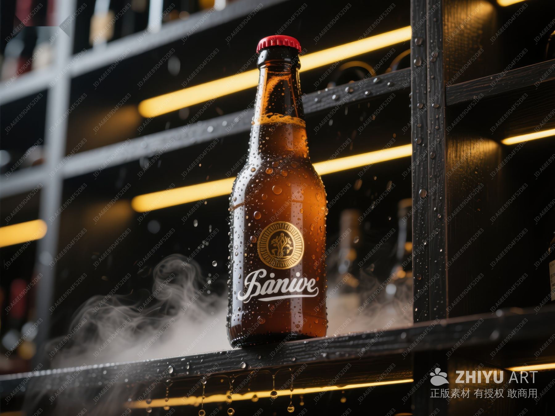 在昏暗的酒吧环境中,一瓶冰镇啤酒瓶摆放在吧台上,瓶