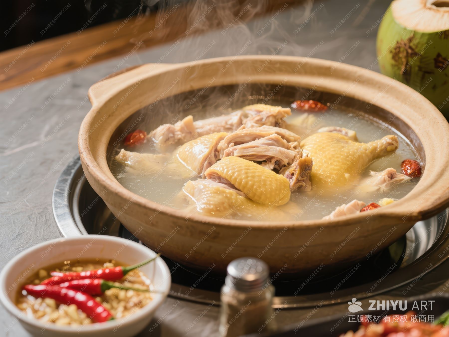 椰子鸡汤热气腾腾,佐料鲜辣诱人 831