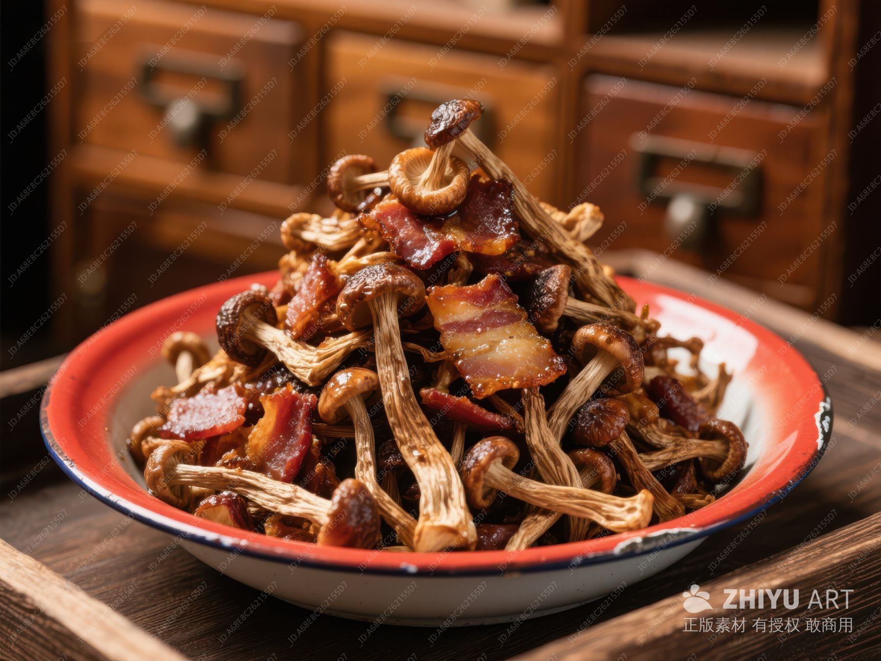 菌菇培根炒菜,木桌上的美味佳肴 424